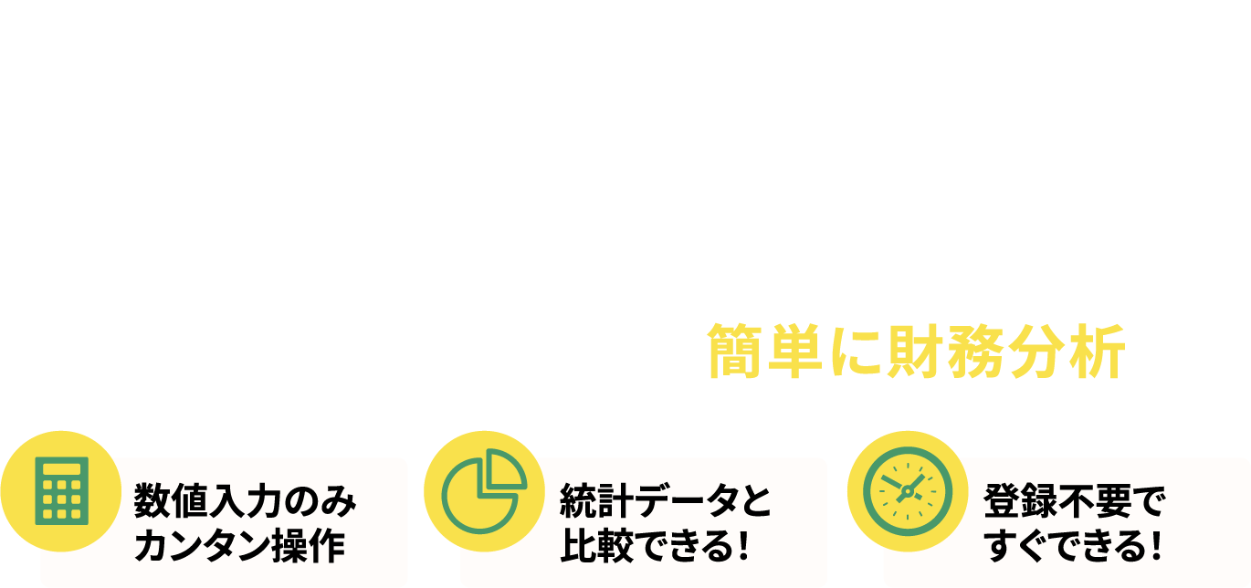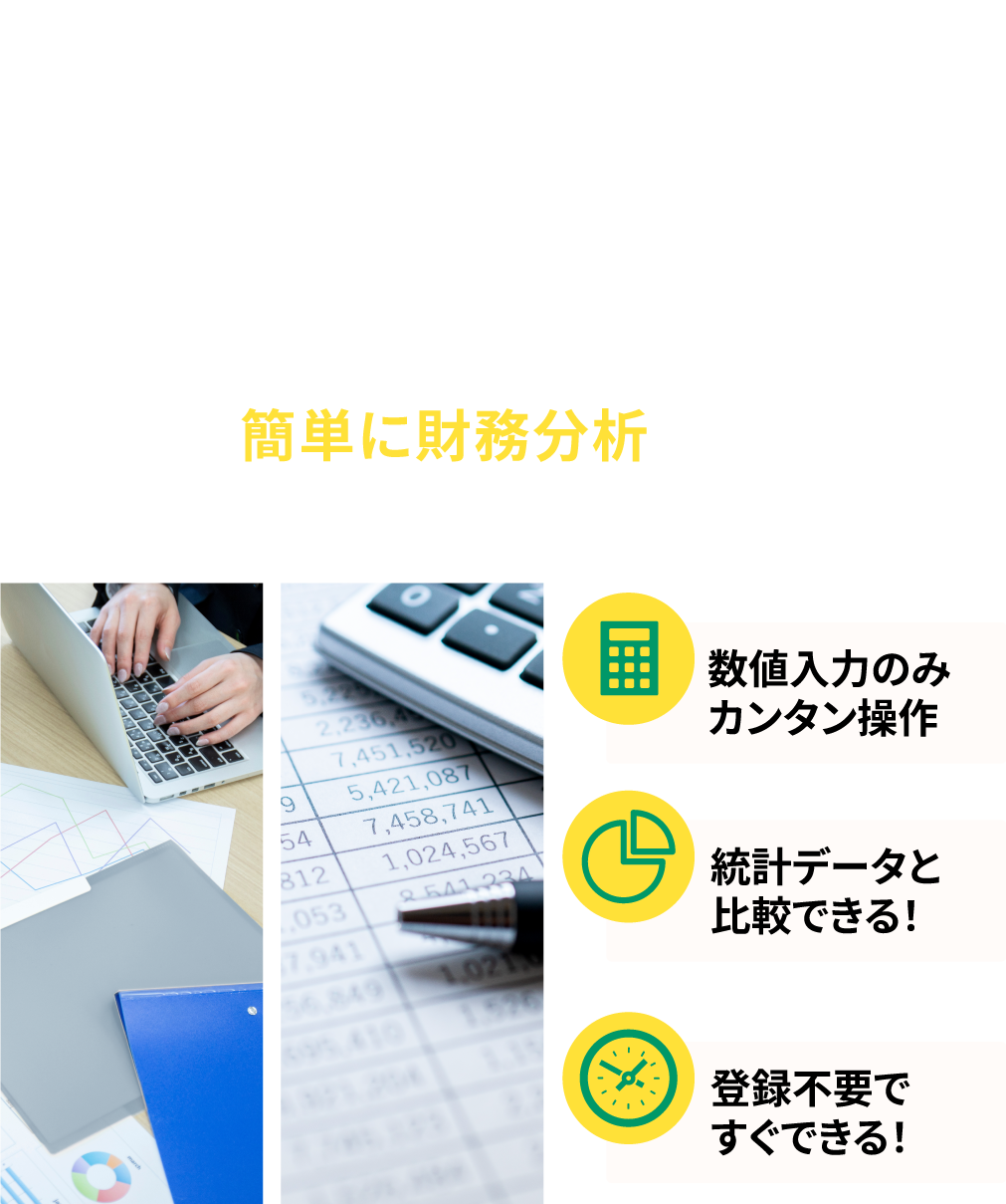 法人情報や個人情報の登録は不要です。入力された決算書の数値の保存も行っておりませんので、情報の漏えいの心配もなく、安心してご利用頂けます。